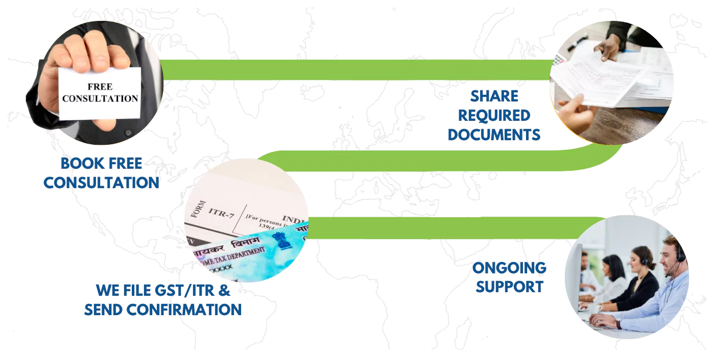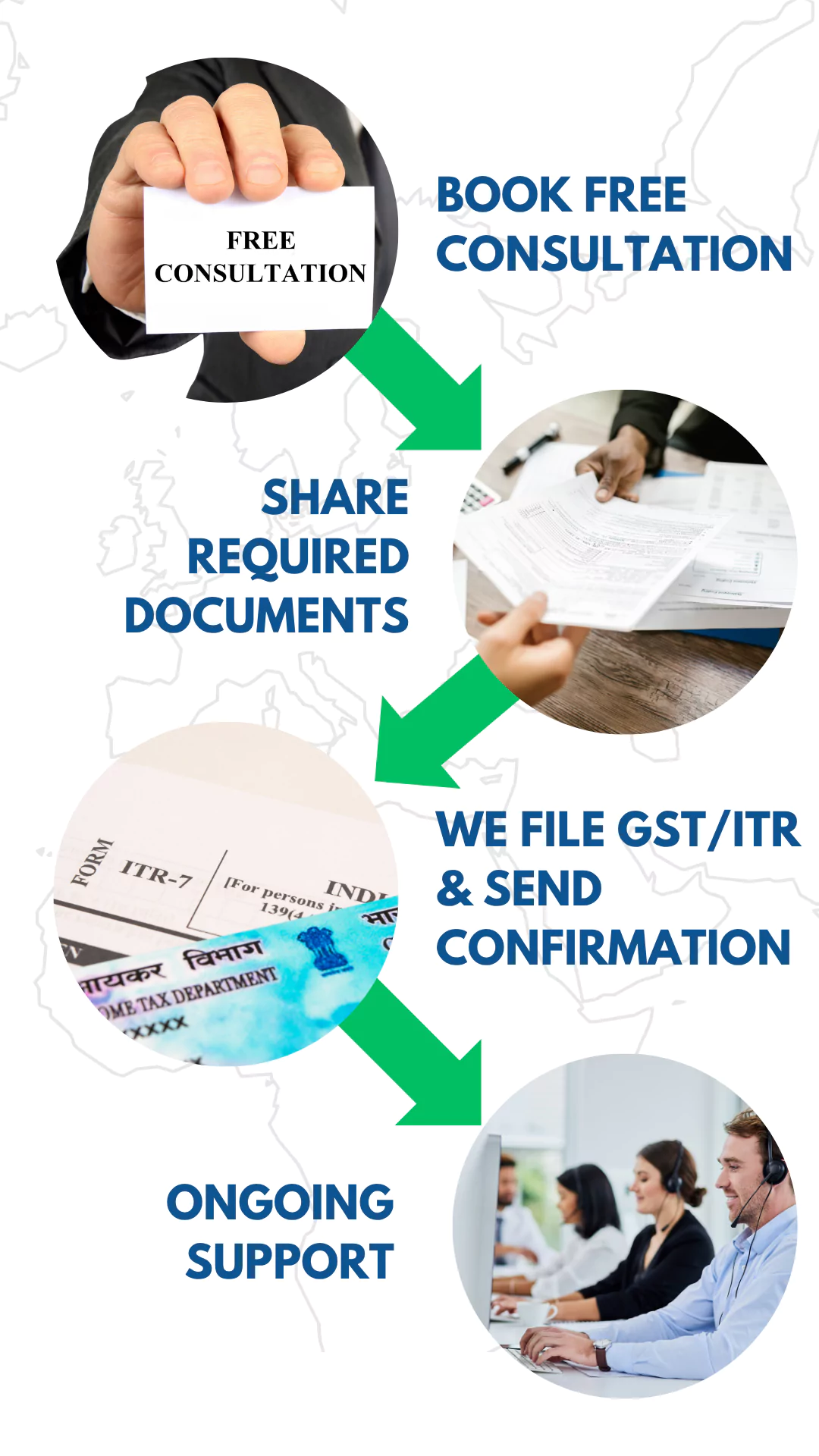 To file GST returns, we require your GSTIN, sales/purchase invoices, input tax credit details, and bank statements. Don’t worry—we guide you through every step.
